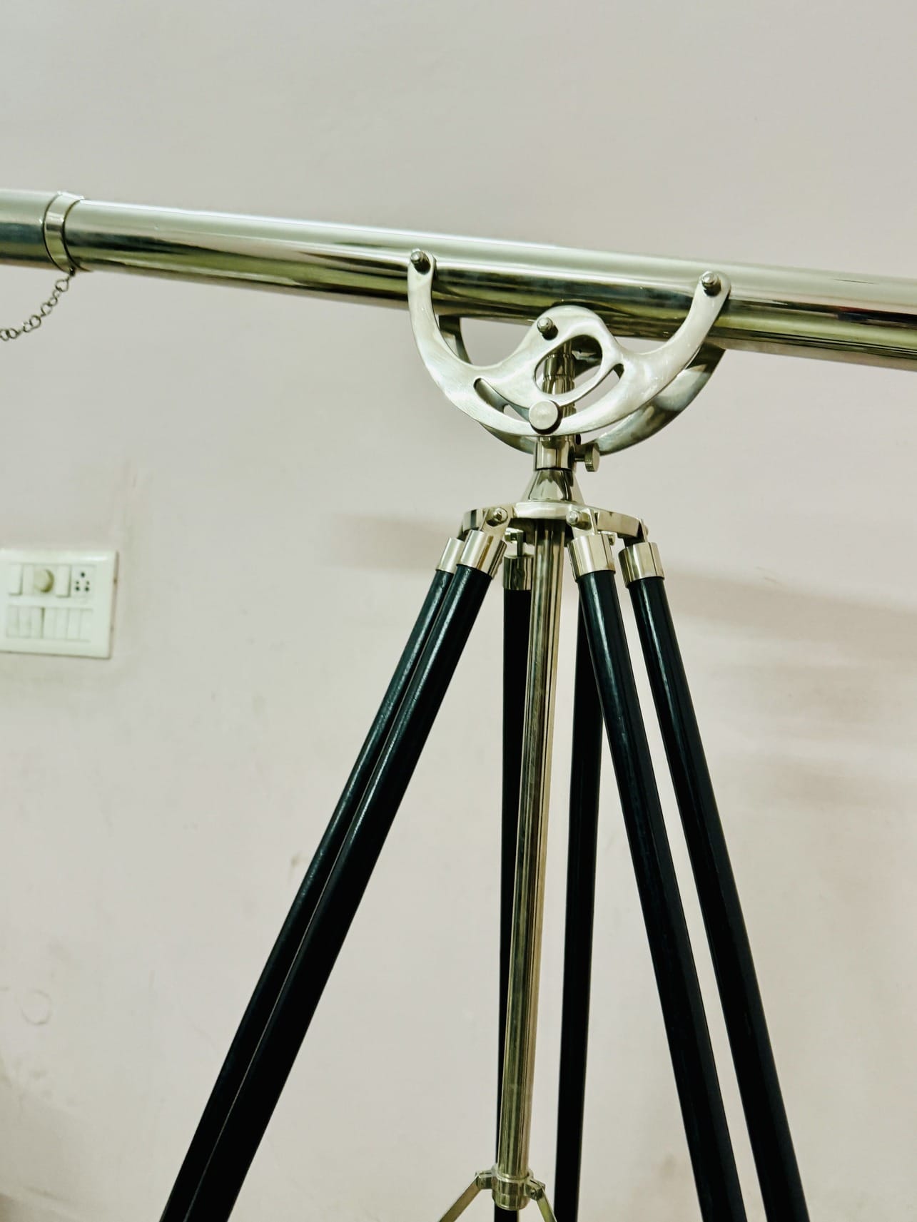 Enhance your space with this handcrafted 1-meter brass telescope replica in stunning silver chrome, mounted on a sturdy wooden tripod. Perfect for home decor, this nautical telescope adds a touch of vintage elegance to any room, from the bedroom to the office. The telescope is fully adjustable, making it a decorative yet functional piece. Whether as a telescope gift for birthdays, anniversaries, or Christmas, this antique-style telescope brings sophistication to balcony decor, nautical themes, or as an office statement piece.