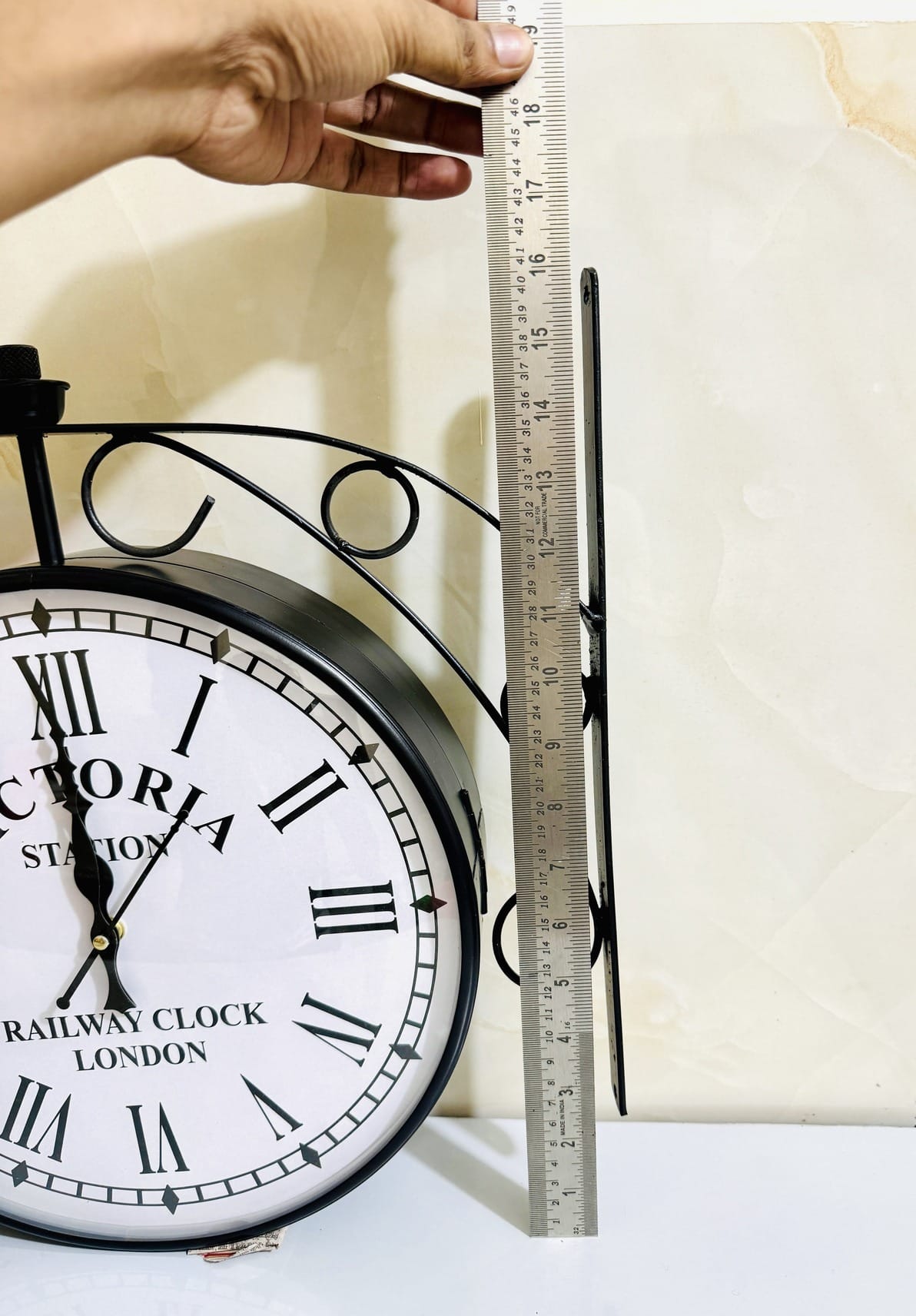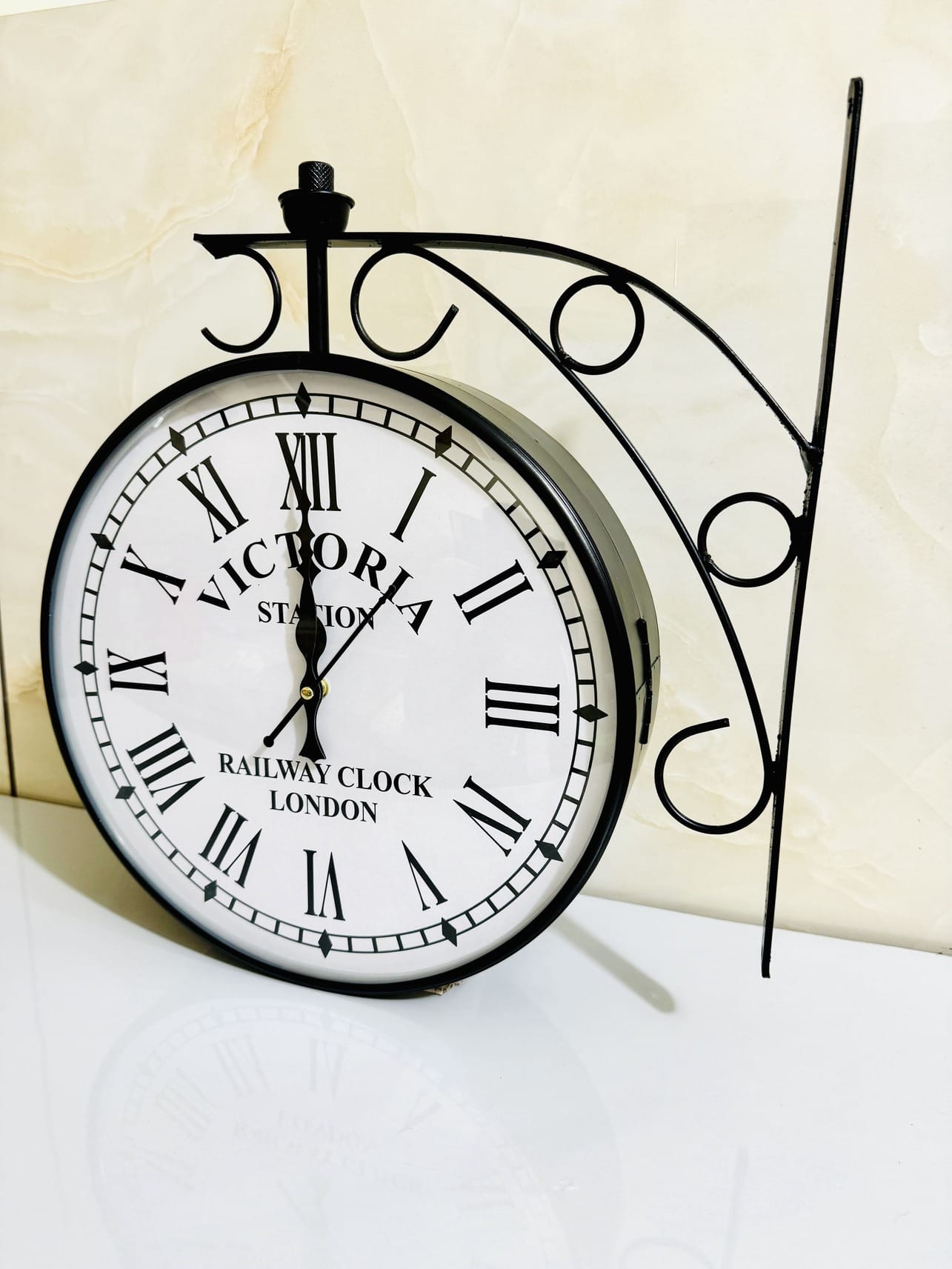 Enhance your decor with this handmade Victoria Station double-sided wall clock—a stunning 16-inch replica perfect for mid-century decor. This unique wall clock features an antique design reminiscent of the royal London station clock, combining classic charm with practical functionality. Its double-sided clock design ensures that time is always visible, adding a touch of elegance to any bedroom decor or mid-century decor setting. Ideal as a wedding gift, anniversary gift, or Christmas decor idea, this vintage clock brings a timeless appeal to your home.